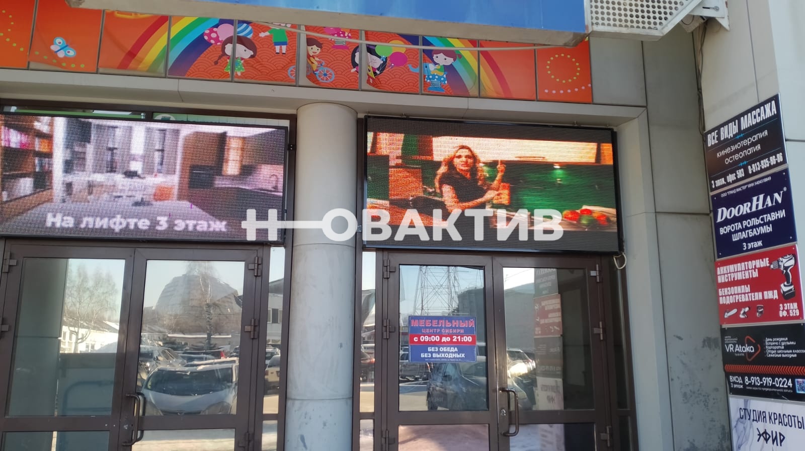 Есть возможность разместить вывеску на фасаде, а также можно разместить видеоролик о компании на экране, расположенном над входом (см фото №8)
