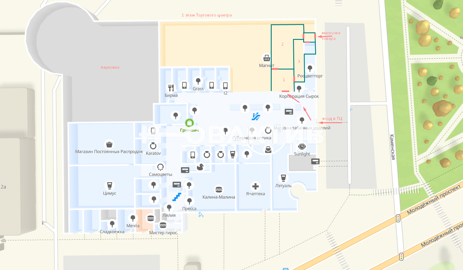 Ваше местоположение будет почти сразу справа от центрального входа в ТРК, перед отделом с Магнитом, что обеспечит вам поток всех покупателей/клиентов, заходящих в ТРК.
