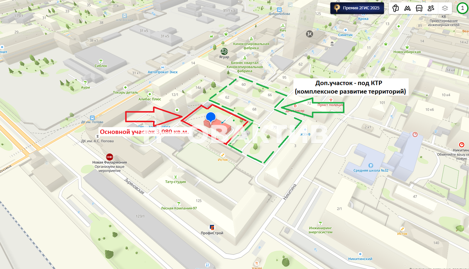Также Дополнительно можно зайти в программу застройки КТР Новосибирск (комплексное развитие территорий) и значительно расширить общую площадь земельного участка, для строительства Жилого комплекса, включая объекты коммерческого, медицинского и/или социального назначения для жителей города Новосибирска
