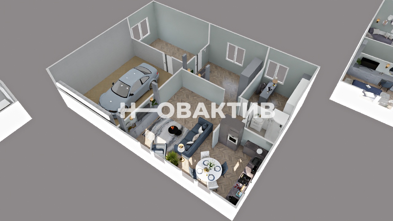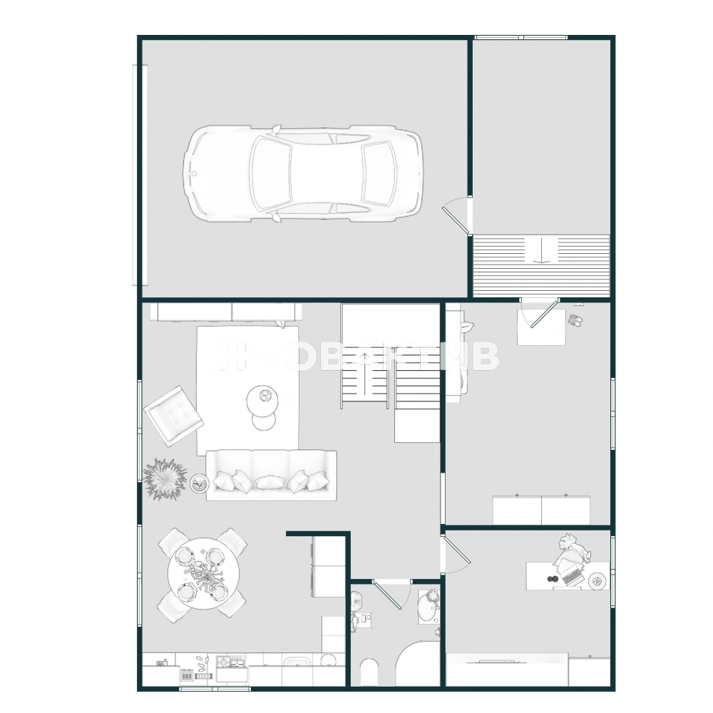 1этаж: куxня-гостинaя, санузел, кабинет (гостевая), холл, веранда, гараж