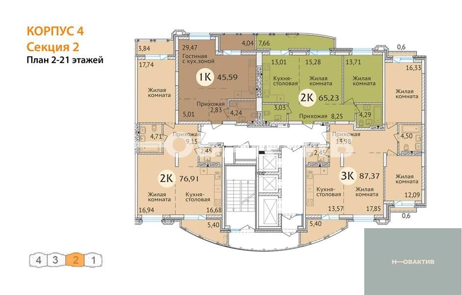 Квартира: 1 к 58,90 кв.м., 17 этаж в комплексе Заельцовский New, 3 очередь, корп.4, сдача: 4кв. , этажей: 23, адрес Новосибирск г., Дуси Ковальчук ул., д. 248/1, Застройщик: Сибирь Девелопмент. Квартиры бизнес-класса для комфортной семейной жизни. Комплекс располагается поблизости от станции метро Заельцовская, площади Калинина и Красного проспекта, что позволяет жильцам легко и быстро добраться до любой точки города. Закрытая территория и уютный двор бережно охраняют частную жизнь. Респектабельная «московская» архитектура, плавные линии фасада и облицовка высококачественным кирпичом делают здание настоящим украшением района. В шаговой доступности от ЖК находятся гимназия, лицей, общеобразовательные и частные школы, детские сады, поликлиника, фитнес-центры, торгово-развлекательные центры, а также крупные зелёные зоны. Любителей природы порадует близкое соседство с самым крупным парком города - Заельцовским парком. Его территория в настоящий момент включает более 35 га лесных насаждений и уютных полян, где можно наслаждаться чистым воздухом и заниматься спортом в любое время года. Семьи с детьми, без сомнения, оценят возможность за 15 минут добраться до одной из крупнейших достопримечательностей города – Новосибирского Зоопарка, который является домом для более 10 тысяч животных. Рядом находится ещё одно великолепное место для семейных прогулок - Дендропарк. Безопасность и комфорт детей и взрослых – главное, что учитывалось при благоустройстве жилого комплекса. Закрытая охраняемая территория, двор без машин, максимум зелени, игровые и спортивные площадки с мягким покрытием, дорожки из террасной доски обеспечивают жителям ЖК возможности для спокойного и активного отдыха в стороне от городской суеты. Автомобили располагаются на двухуровневой подземной парковке на 195 машиномест. Имеются отдельные гаражные боксы. Квартиры в жилом комплексе отличаются разнообразием планировок (от однокомнатной студии до большой четырёхкомантной квартиры), просторными комнатами и большими кухнями. Все внутренние решения нацелены на создание максимально светлого пространства: большие плоскости остекления, панорамные окна, эркеры, позволяющие воплощать оригинальные дизайнерские идеи. Удобные планировки квартир, просторные лоджии, единая система видеонаблюдения, кладовые помещения для жильцов, собственная управляющая компания – в ЖК созданы все условия для комфорта и благополучия жильцов. Дом оснащён бесшумными скоростными лифтами от квартиры до парковки, современными системами отопления и противопожарным оборудованием. На первом этаже жилого комплекса располагаются коммерческие помещения семейного формата: развивающие студии для малышей, салоны красоты и магазины для взрослых, а также уютные кафе, где можно приятно провести время с друзьями и близкими. Для удобства жильцов и посетителей бизнес-зоны жилого комплекса построен дополнительный «карман», который делает доступным подъезд и парковку у офисов и магазинов. Все входы в коммерческие помещения отделены от жилой зоны и располагаются со стороны улицы Дуси Ковальчук.