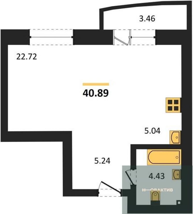 - Жилая площадь 22.72 м²