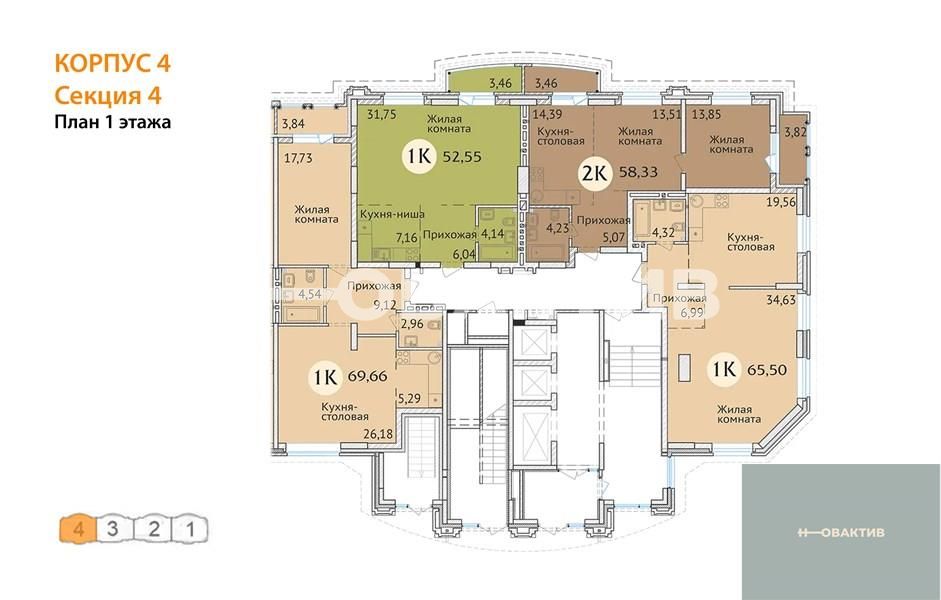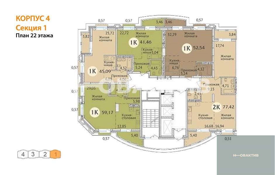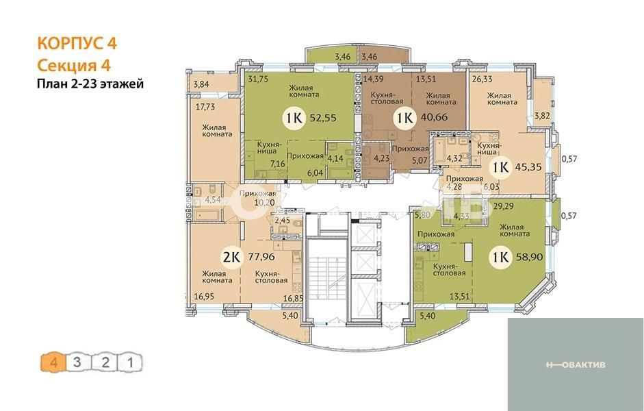 Квартира: 1 к 52,55 кв.м., 23 этаж в комплексе Заельцовский New, 3 очередь, корп.4, сдача: 4кв. , этажей: 23, адрес Новосибирск г., Дуси Ковальчук ул., д. 248/1, Застройщик: Сибирь Девелопмент. Квартиры бизнес-класса для комфортной семейной жизни. Комплекс располагается поблизости от станции метро Заельцовская, площади Калинина и Красного проспекта, что позволяет жильцам легко и быстро добраться до любой точки города. Закрытая территория и уютный двор бережно охраняют частную жизнь. Респектабельная «московская» архитектура, плавные линии фасада и облицовка высококачественным кирпичом делают здание настоящим украшением района. В шаговой доступности от ЖК находятся гимназия, лицей, общеобразовательные и частные школы, детские сады, поликлиника, фитнес-центры, торгово-развлекательные центры, а также крупные зелёные зоны. Любителей природы порадует близкое соседство с самым крупным парком города - Заельцовским парком. Его территория в настоящий момент включает более 35 га лесных насаждений и уютных полян, где можно наслаждаться чистым воздухом и заниматься спортом в любое время года. Семьи с детьми, без сомнения, оценят возможность за 15 минут добраться до одной из крупнейших достопримечательностей города – Новосибирского Зоопарка, который является домом для более 10 тысяч животных. Рядом находится ещё одно великолепное место для семейных прогулок - Дендропарк. Безопасность и комфорт детей и взрослых – главное, что учитывалось при благоустройстве жилого комплекса. Закрытая охраняемая территория, двор без машин, максимум зелени, игровые и спортивные площадки с мягким покрытием, дорожки из террасной доски обеспечивают жителям ЖК возможности для спокойного и активного отдыха в стороне от городской суеты. Автомобили располагаются на двухуровневой подземной парковке на 195 машиномест. Имеются отдельные гаражные боксы. Квартиры в жилом комплексе отличаются разнообразием планировок (от однокомнатной студии до большой четырёхкомантной квартиры), просторными комнатами и большими кухнями. Все внутренние решения нацелены на создание максимально светлого пространства: большие плоскости остекления, панорамные окна, эркеры, позволяющие воплощать оригинальные дизайнерские идеи. Удобные планировки квартир, просторные лоджии, единая система видеонаблюдения, кладовые помещения для жильцов, собственная управляющая компания – в ЖК созданы все условия для комфорта и благополучия жильцов. Дом оснащён бесшумными скоростными лифтами от квартиры до парковки, современными системами отопления и противопожарным оборудованием. На первом этаже жилого комплекса располагаются коммерческие помещения семейного формата: развивающие студии для малышей, салоны красоты и магазины для взрослых, а также уютные кафе, где можно приятно провести время с друзьями и близкими. Для удобства жильцов и посетителей бизнес-зоны жилого комплекса построен дополнительный «карман», который делает доступным подъезд и парковку у офисов и магазинов. Все входы в коммерческие помещения отделены от жилой зоны и располагаются со стороны улицы Дуси Ковальчук.