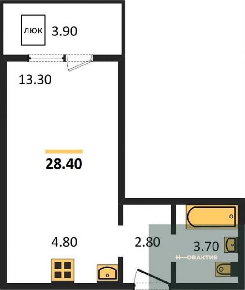 - Общая площадь 28.4 м²