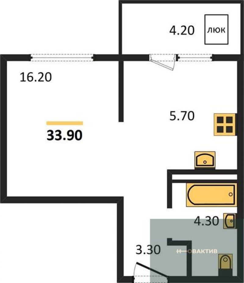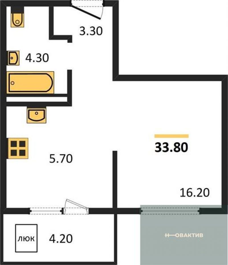 - Общая площадь 33.8 м²