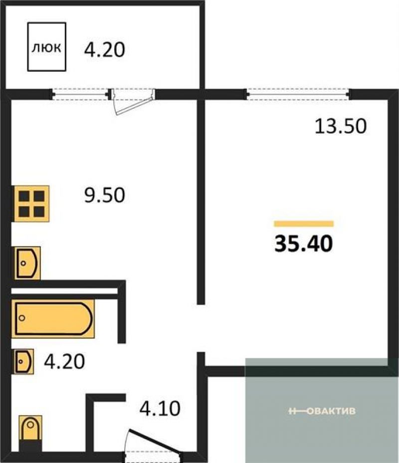 - Общая площадь 35.4 м²