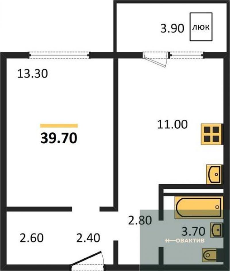 - Общая площадь 39.7 м²