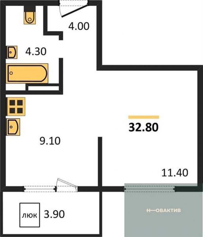 - Общая площадь 32.8 м²