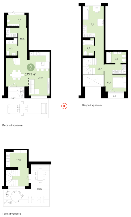 Террасы — огороженные участки с террасной доской. На первых этажах террасы отделяют квартиру от пространства двора с помощью небольшой изгороди и кустарников. Террасы-палисадники выступают буфером перед отдельным входом в квартиру. На последних этажах они имеют большую площадь и безопасное ограждение. На террасе можно обустроить место отдыха, поставить качели, разместить гамак или детскую игровую. В прилегающих комнатах сделаны окна в пол и квартира наполняется светом. Террасы придают квартирам загородный характер проживания. Это приусадебный участок, который позволяет проводить время на свежем воздухе, оставаясь в пространстве своего жилья.