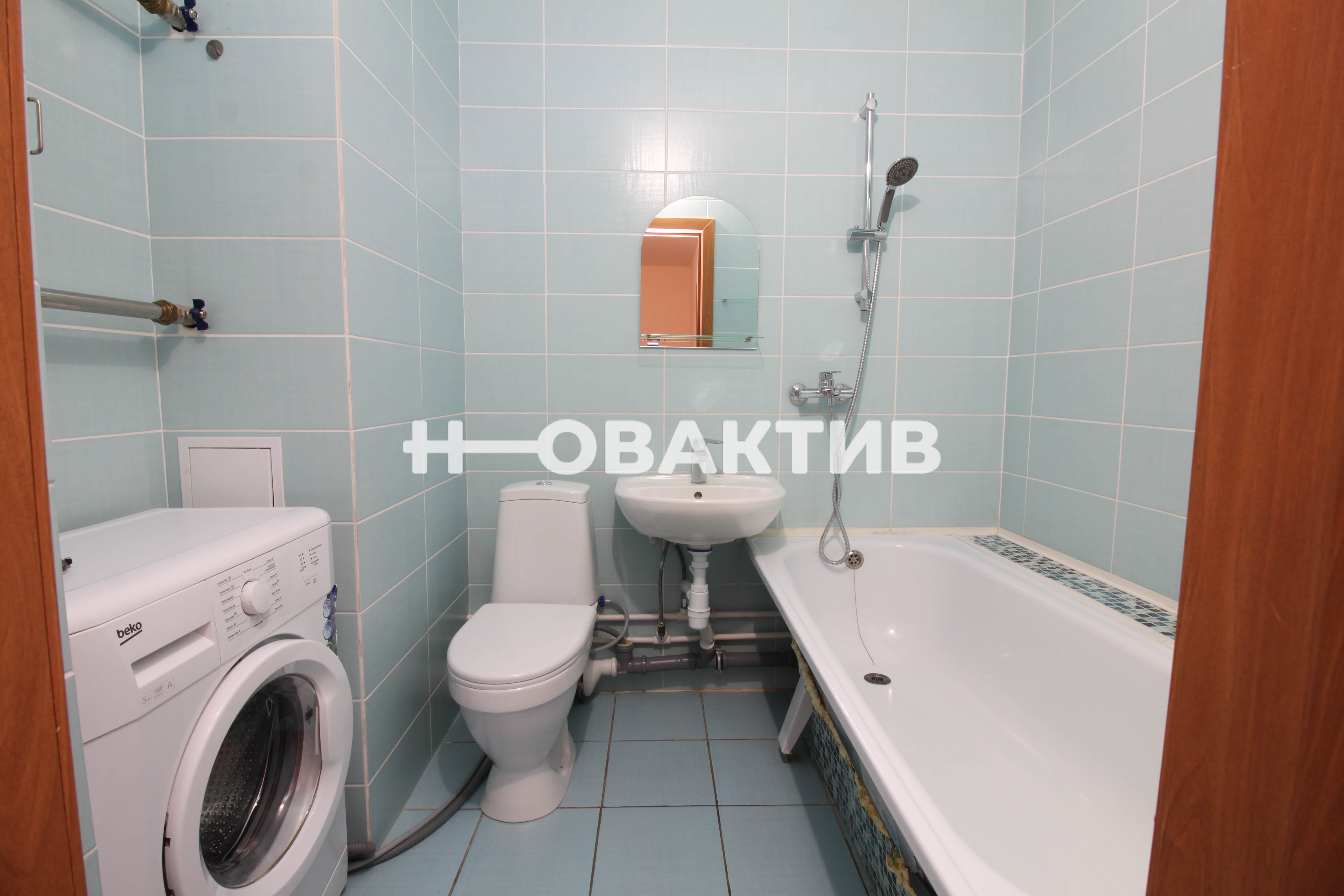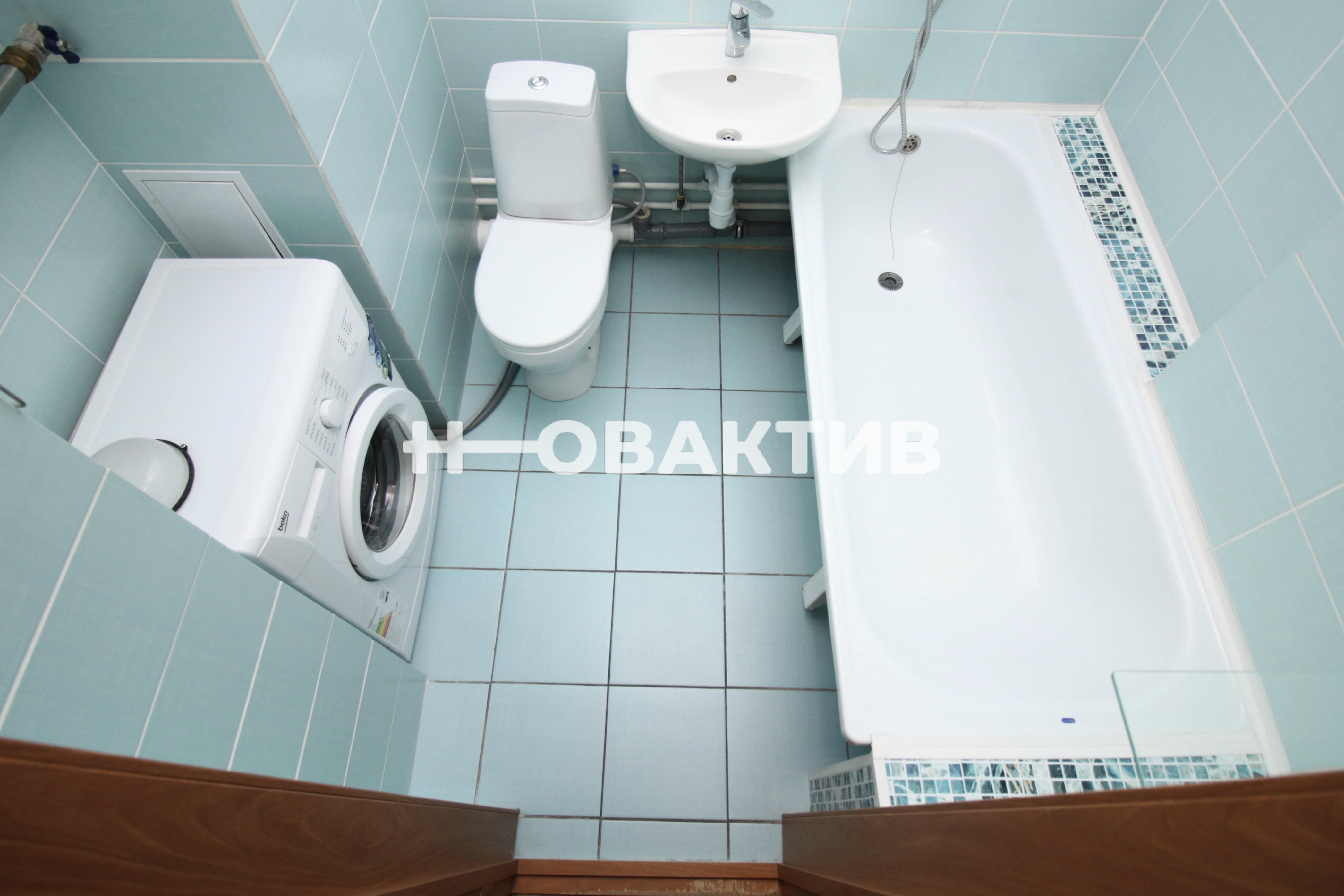 Санузел совмещенный. В нем установлена свежая сантехника: ванна, унитаз, раковина с зеркалом, стиральная машина.
