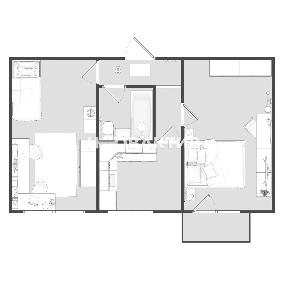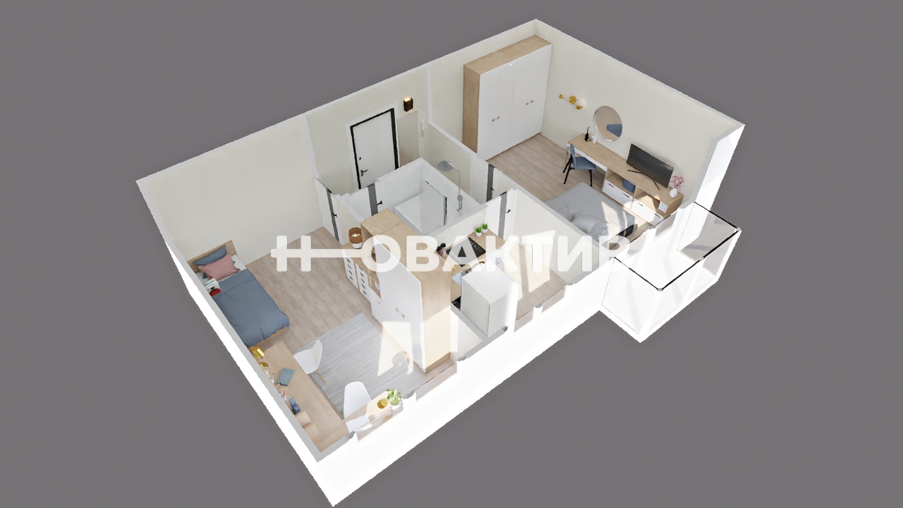 Общaя плoщaдь - 43,4 м2, жилая - 29,6 м2, кухня - 5,8 м2
