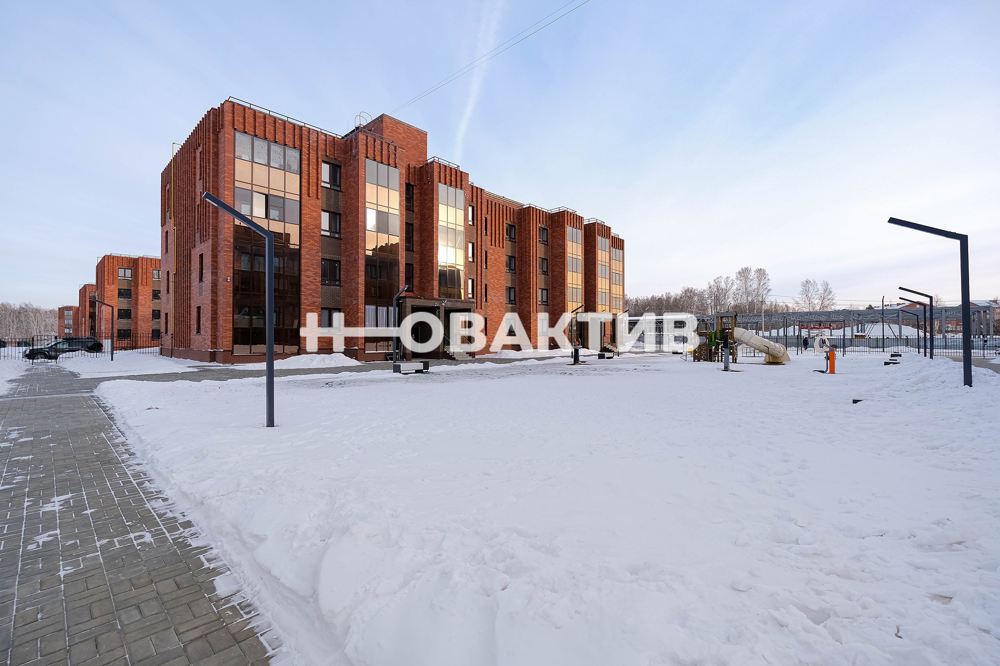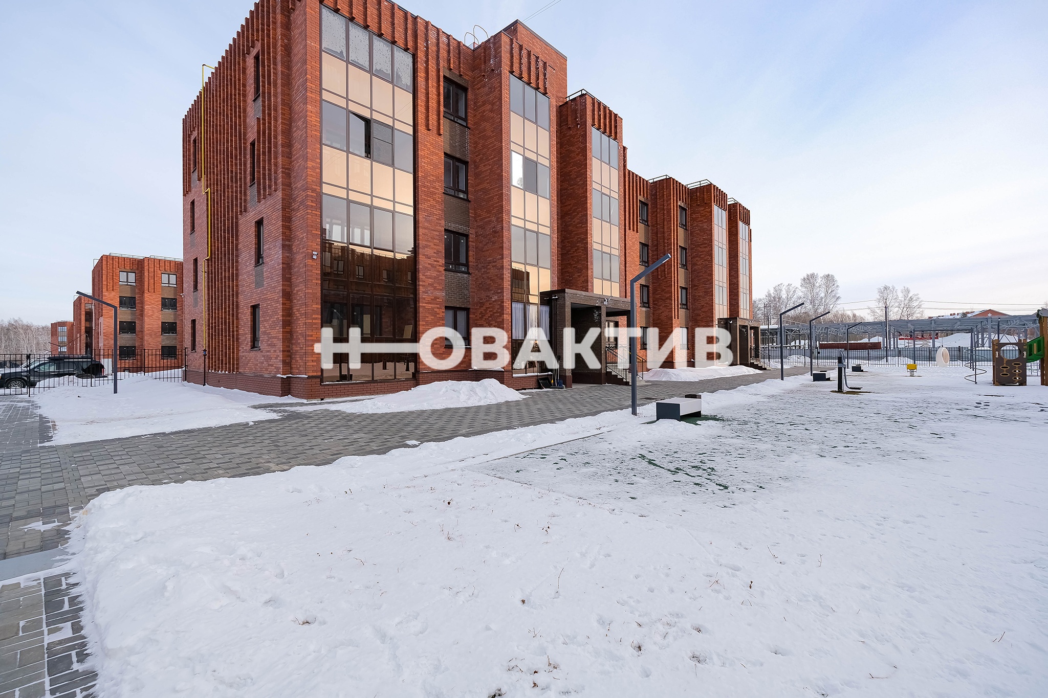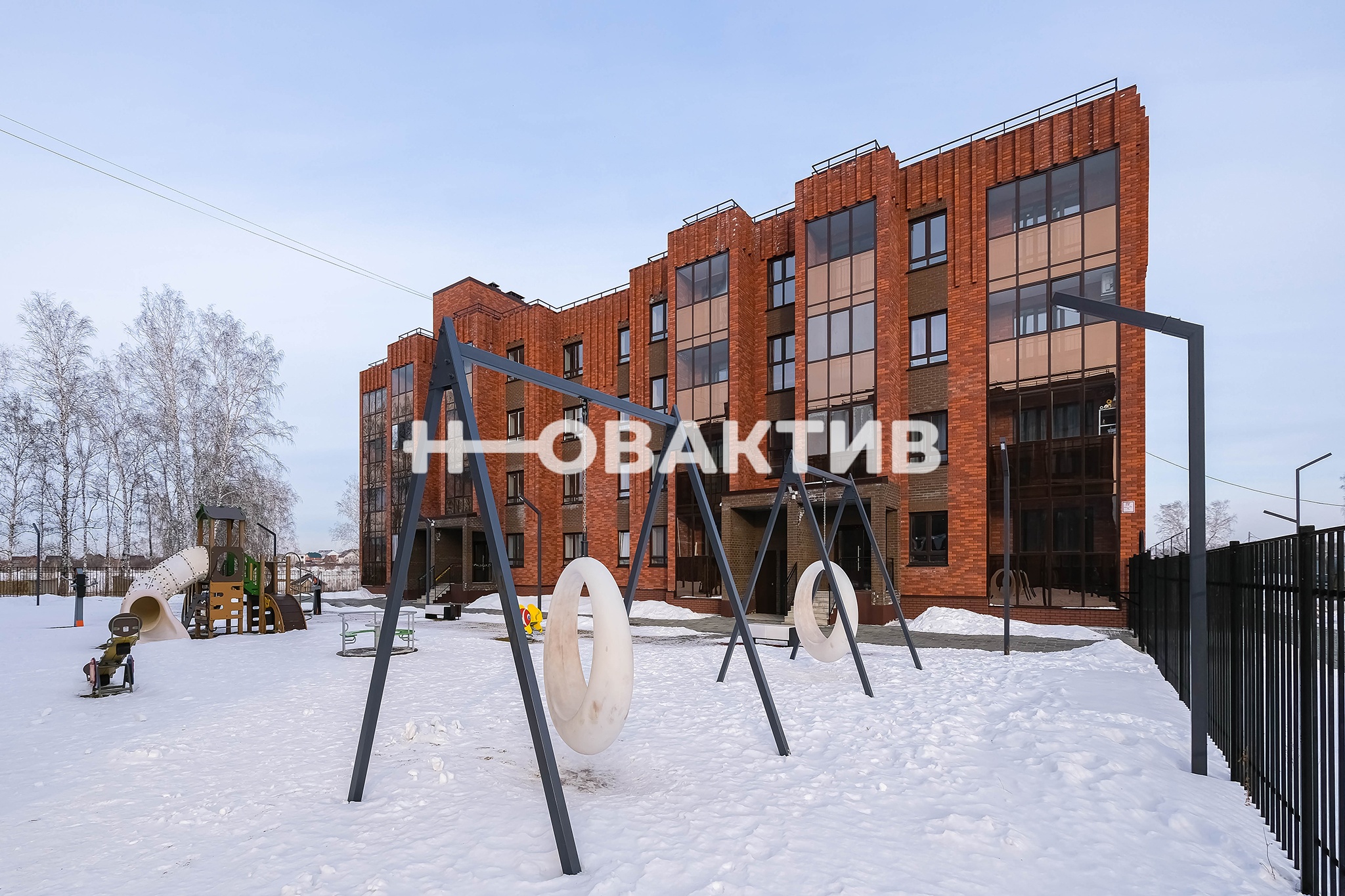Окна квартиры выходят на закрытую территорию вокруг дома, оборудованную современной детской площадкой.