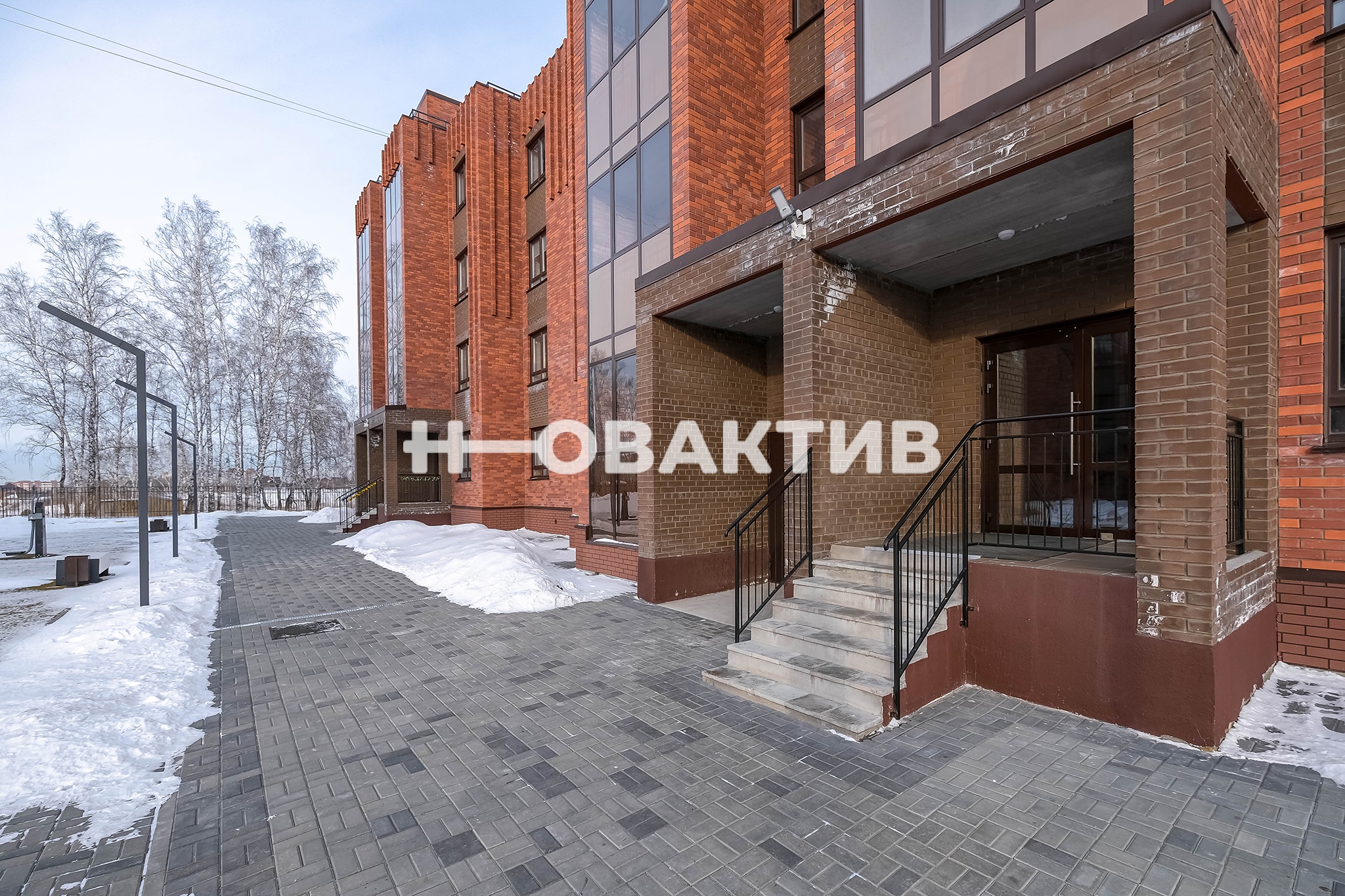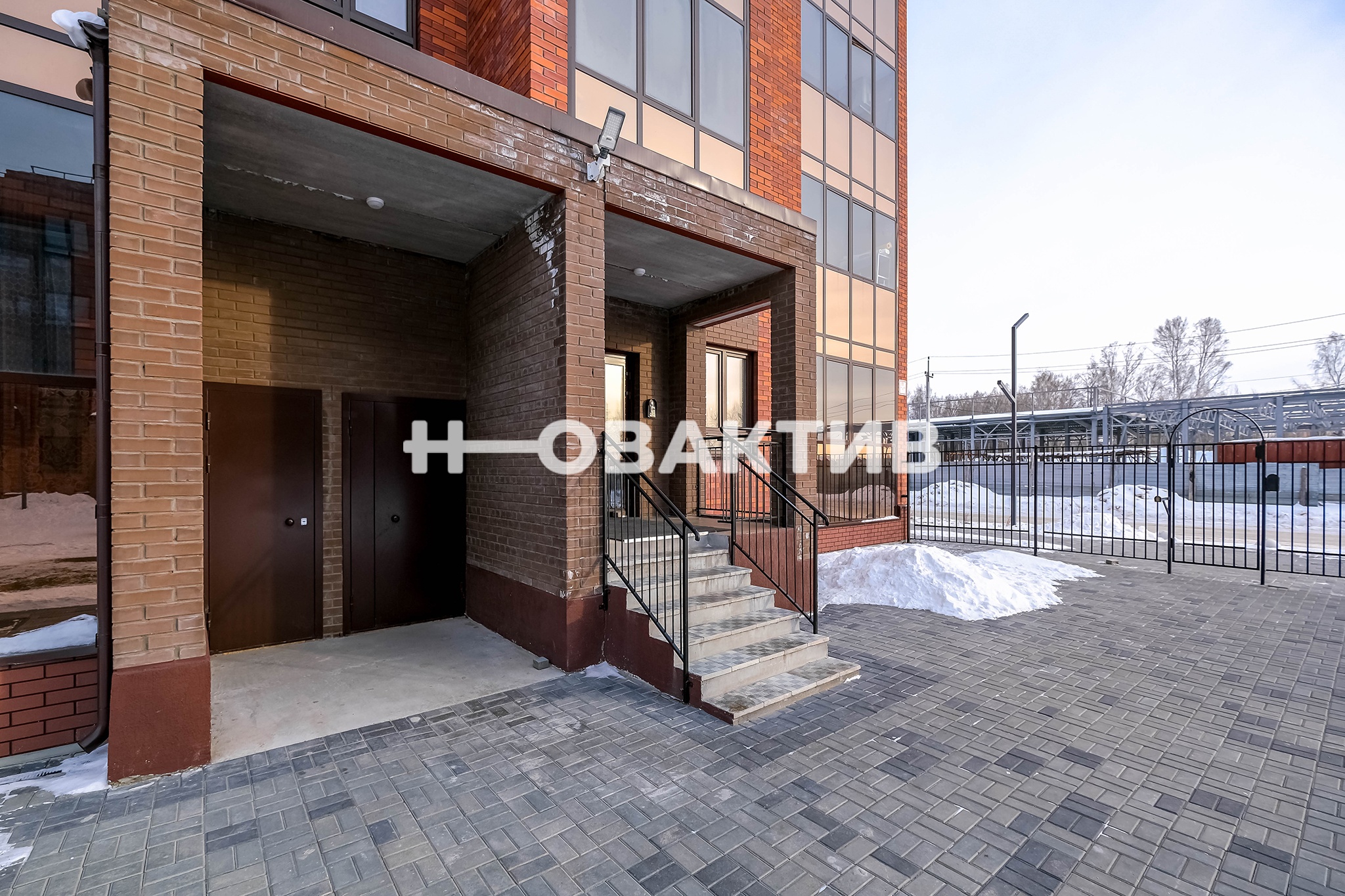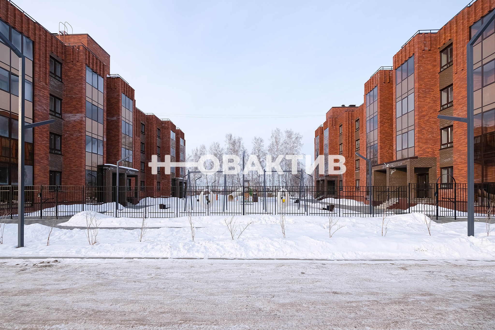 Окна квартиры выходят на закрытую территорию вокруг дома, оборудованную современной детской площадкой.