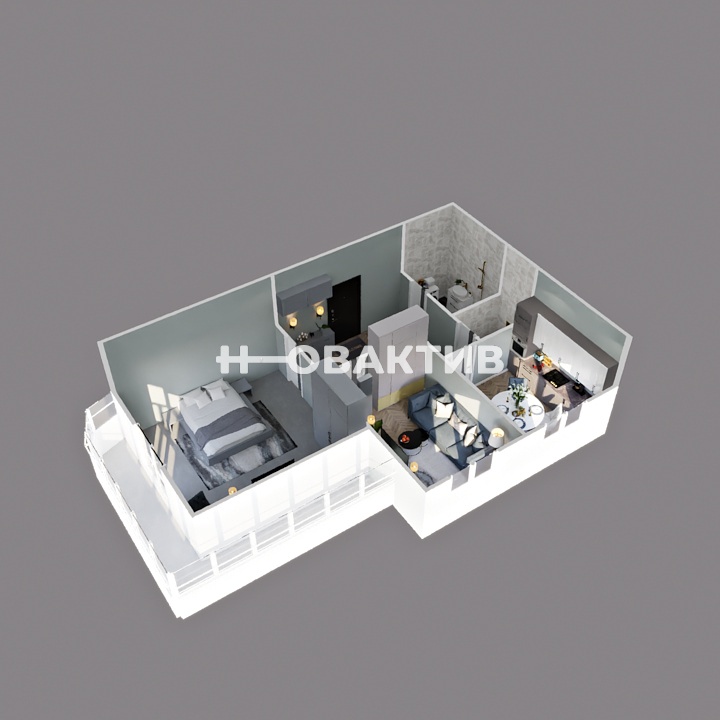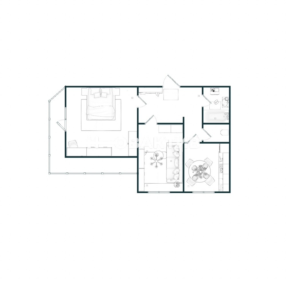 В квapтире две изолированные комнаты 19 (зал) и 12 м2 (спальня), кухня 9 м2, раздельный санузел, большая угловая лоджия