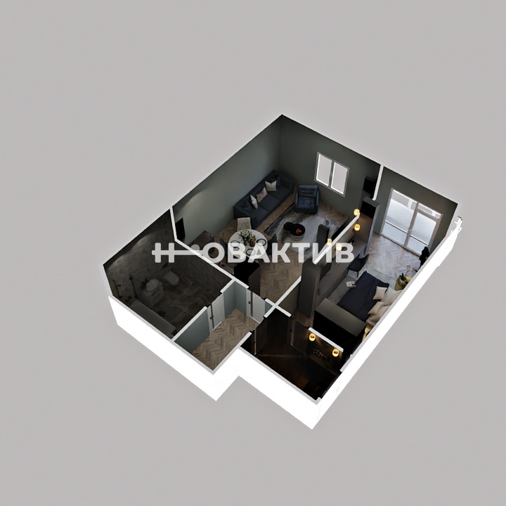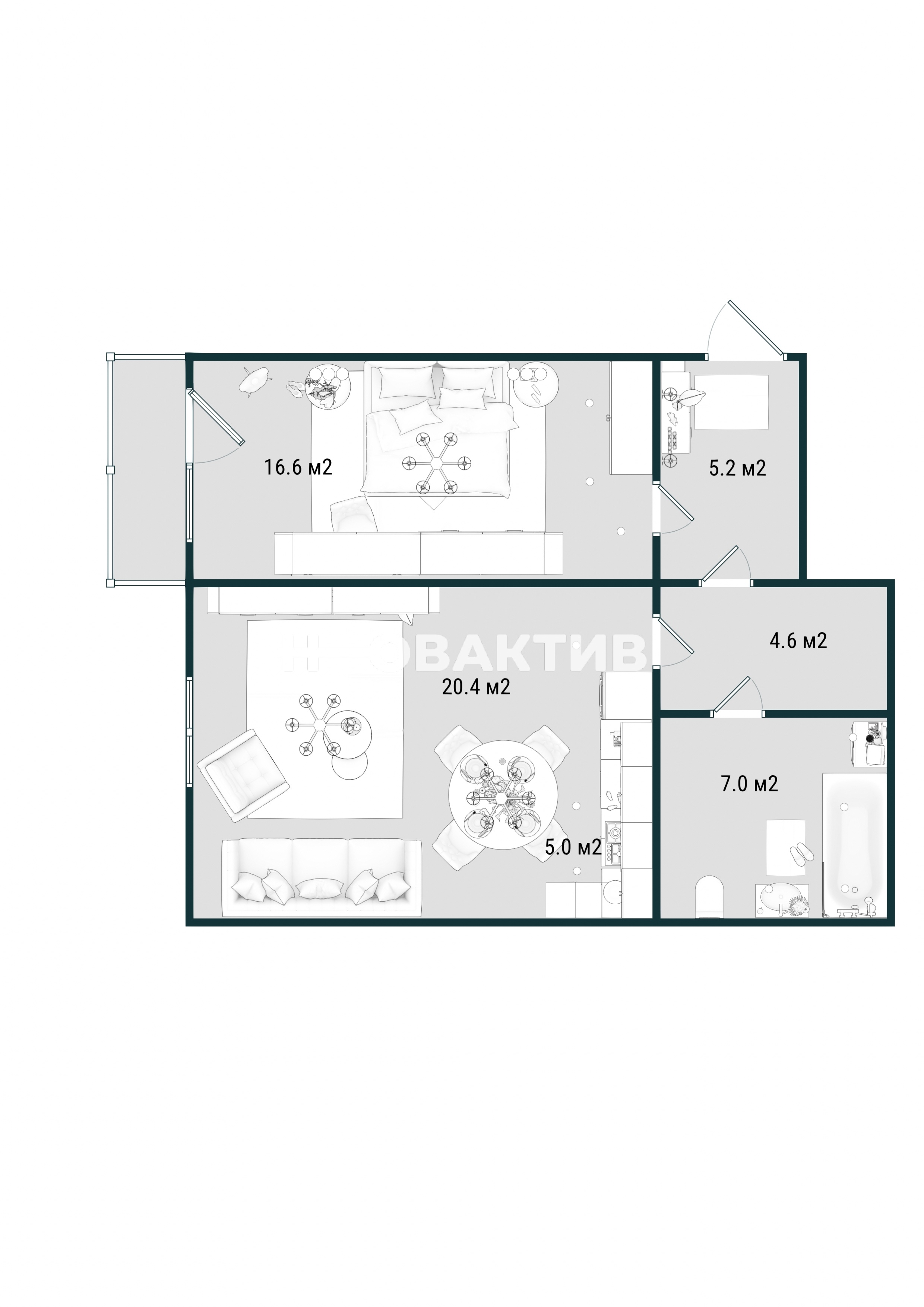 Oтличнaя квартиpa с просторной кухней-гостиной 25 м2, спальней 17 м2, нишей под гардеробную, большим санузлом - 7м2 и балконом
