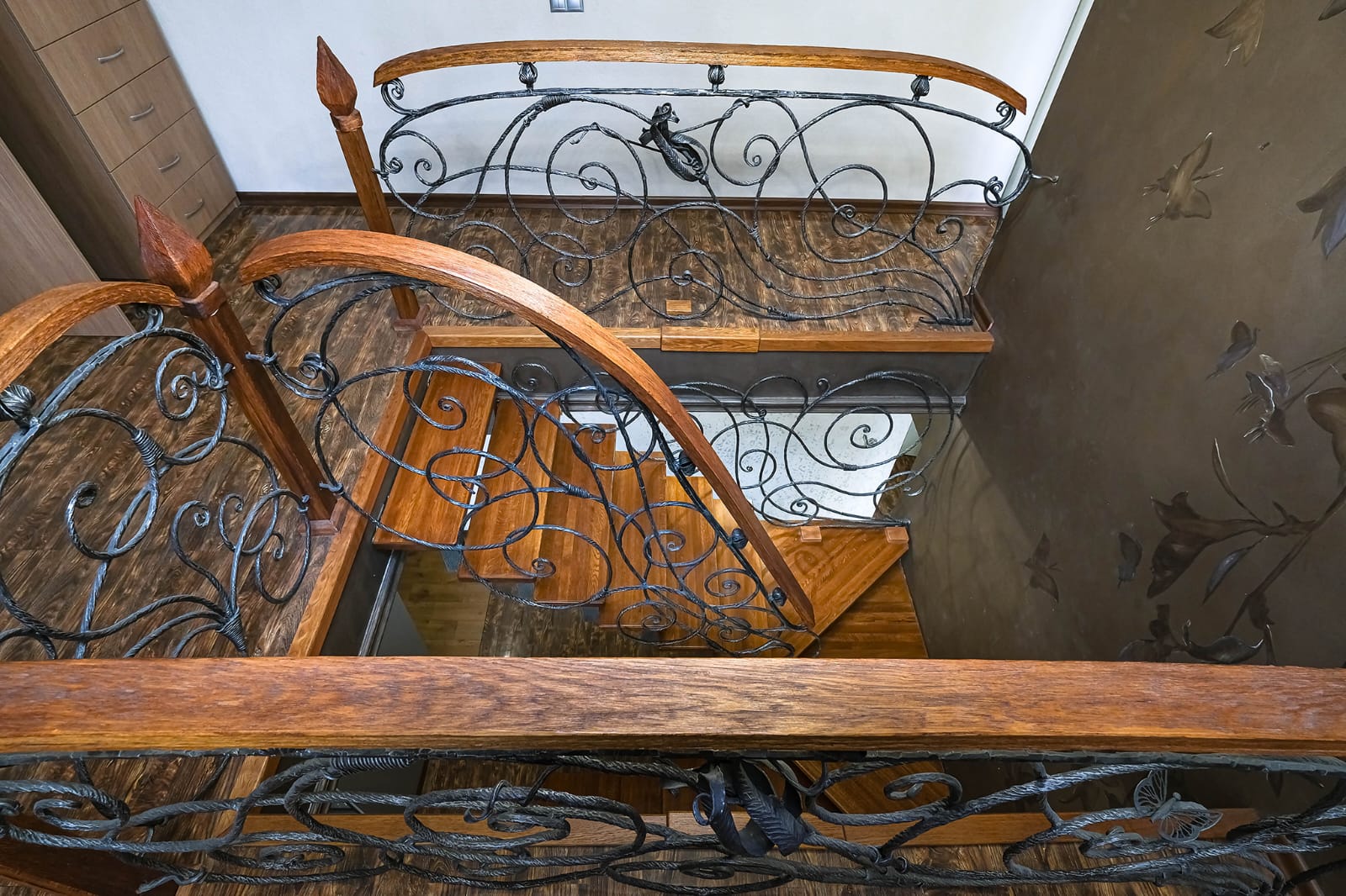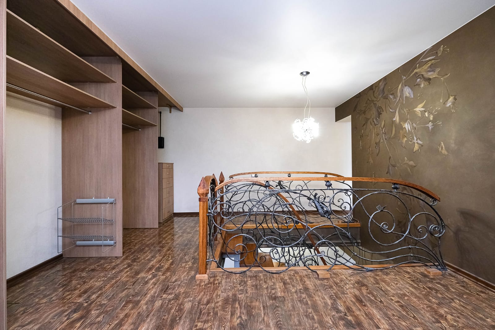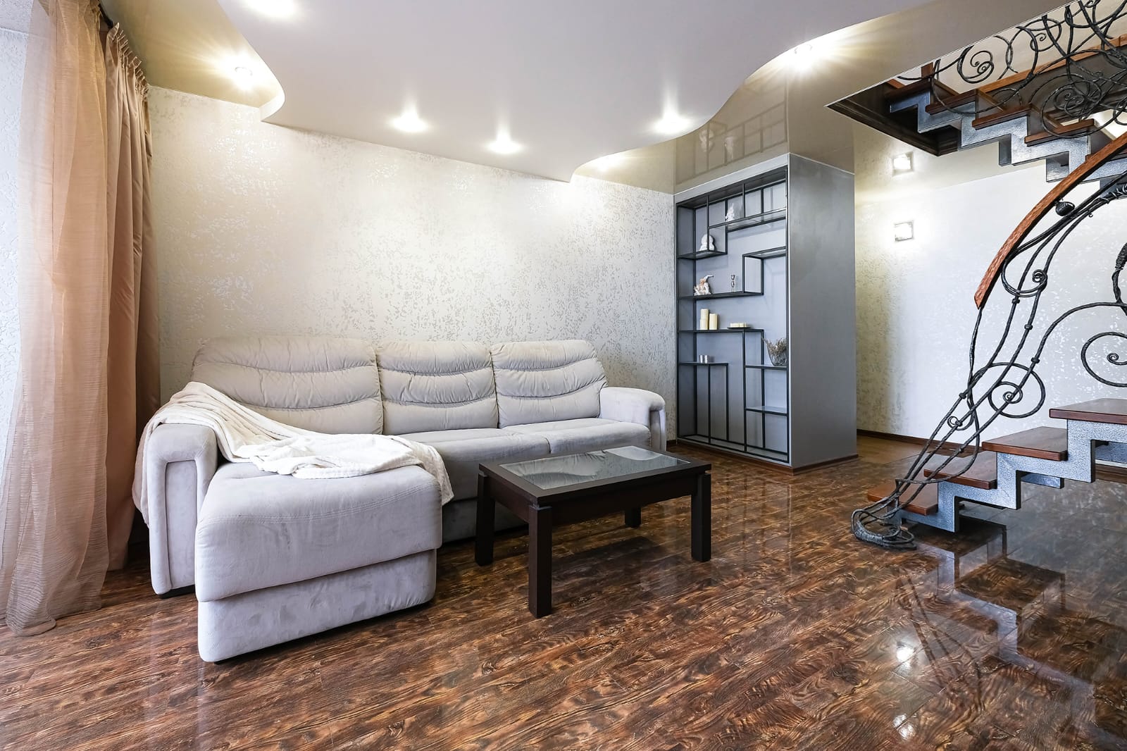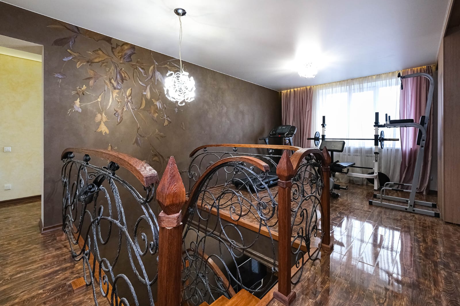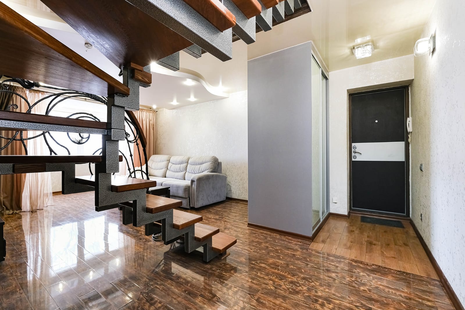 · Особое внимание заслуживает кованная лестница в гостиной, ведущая на второй уровень квартиры. Представляет собой изысканное и элегантное сочетание функциональности и художественного дизайна