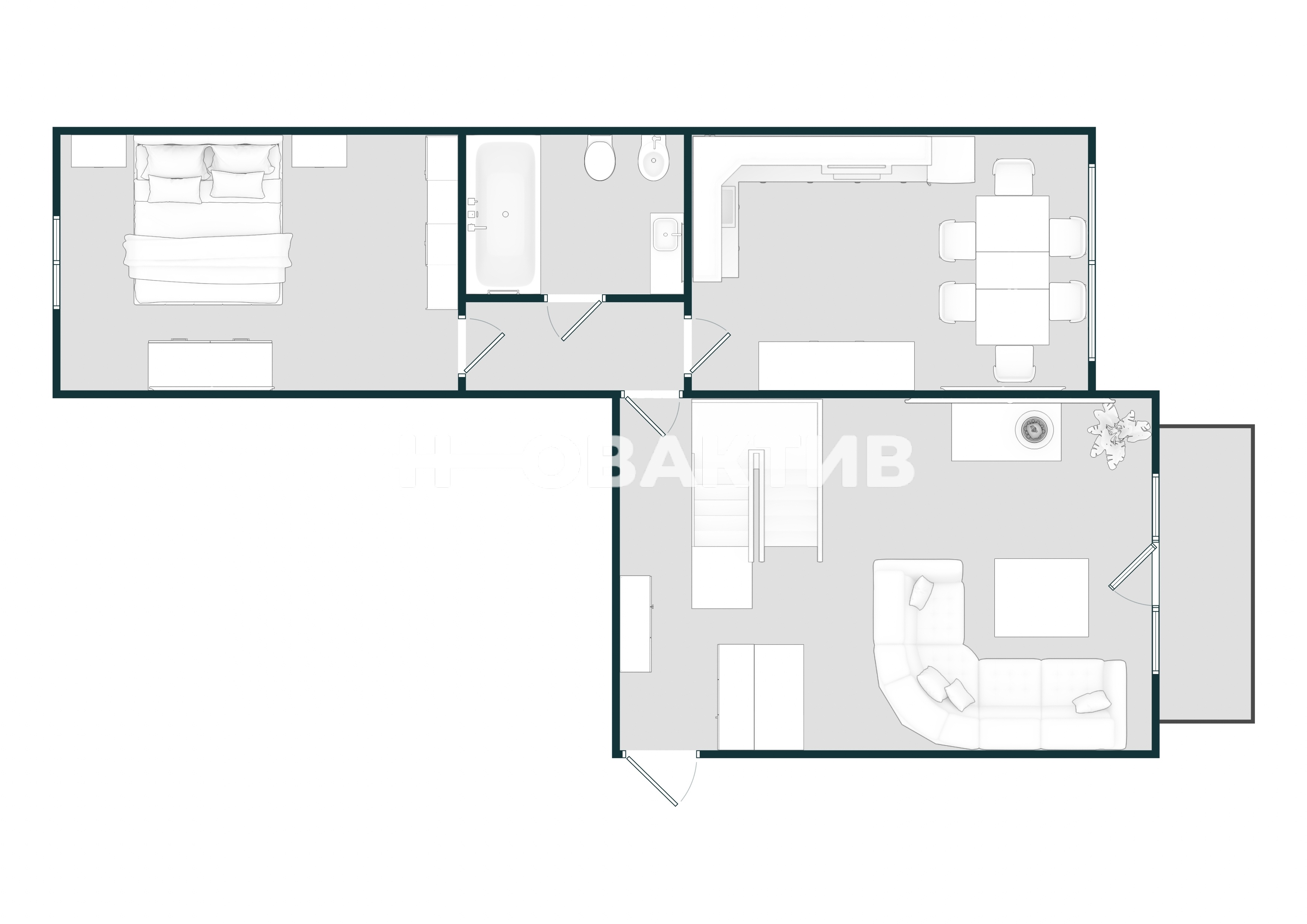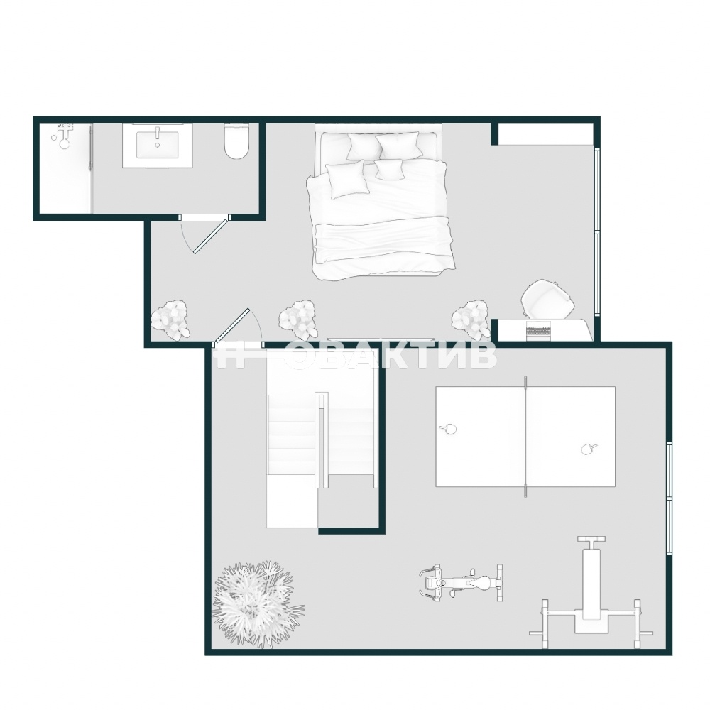 · Второй уровень квартиры включает просторное помещение 30,1 кв.м, которое идеально подходит для создания зоны спорта и отдыха