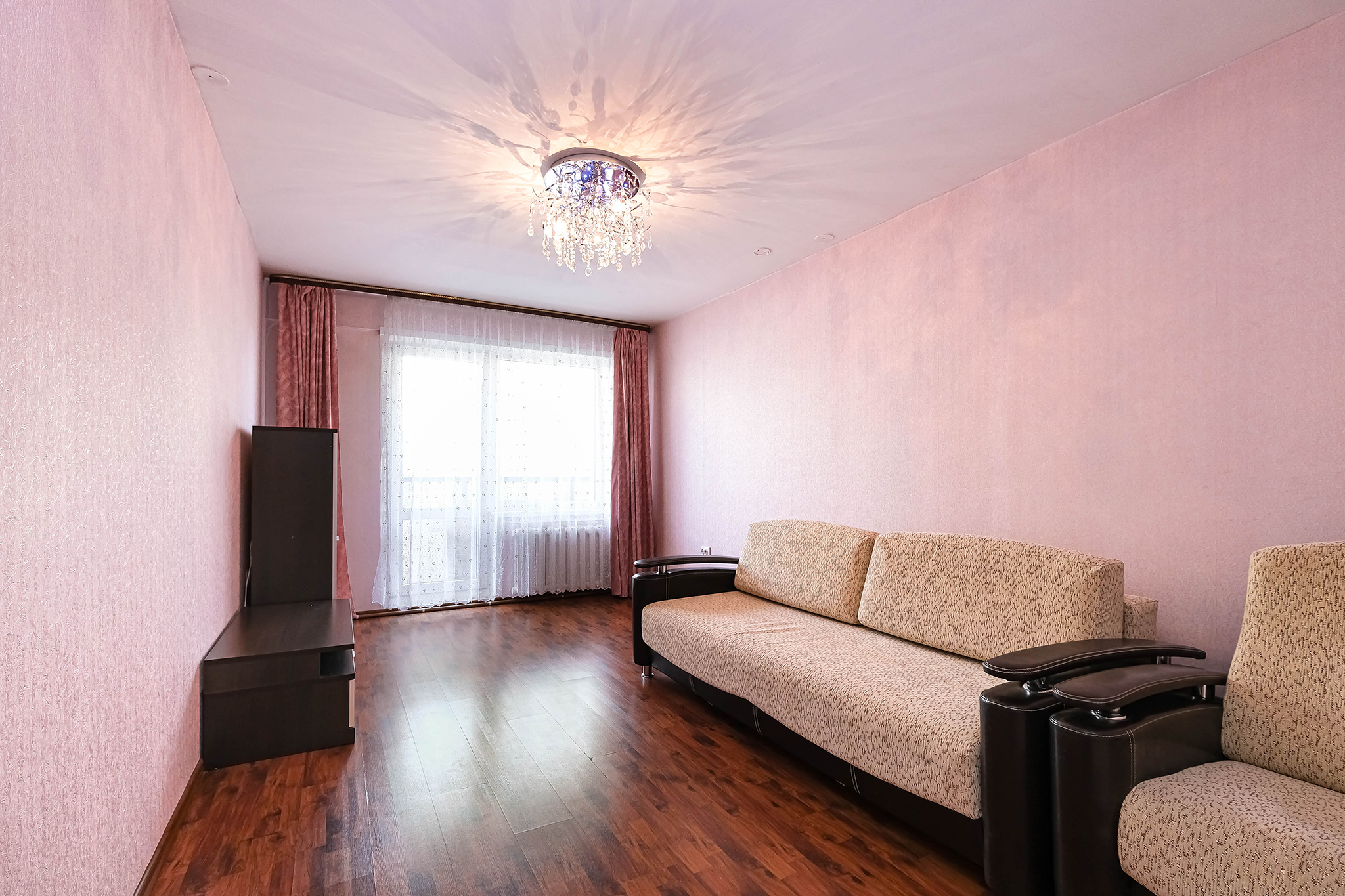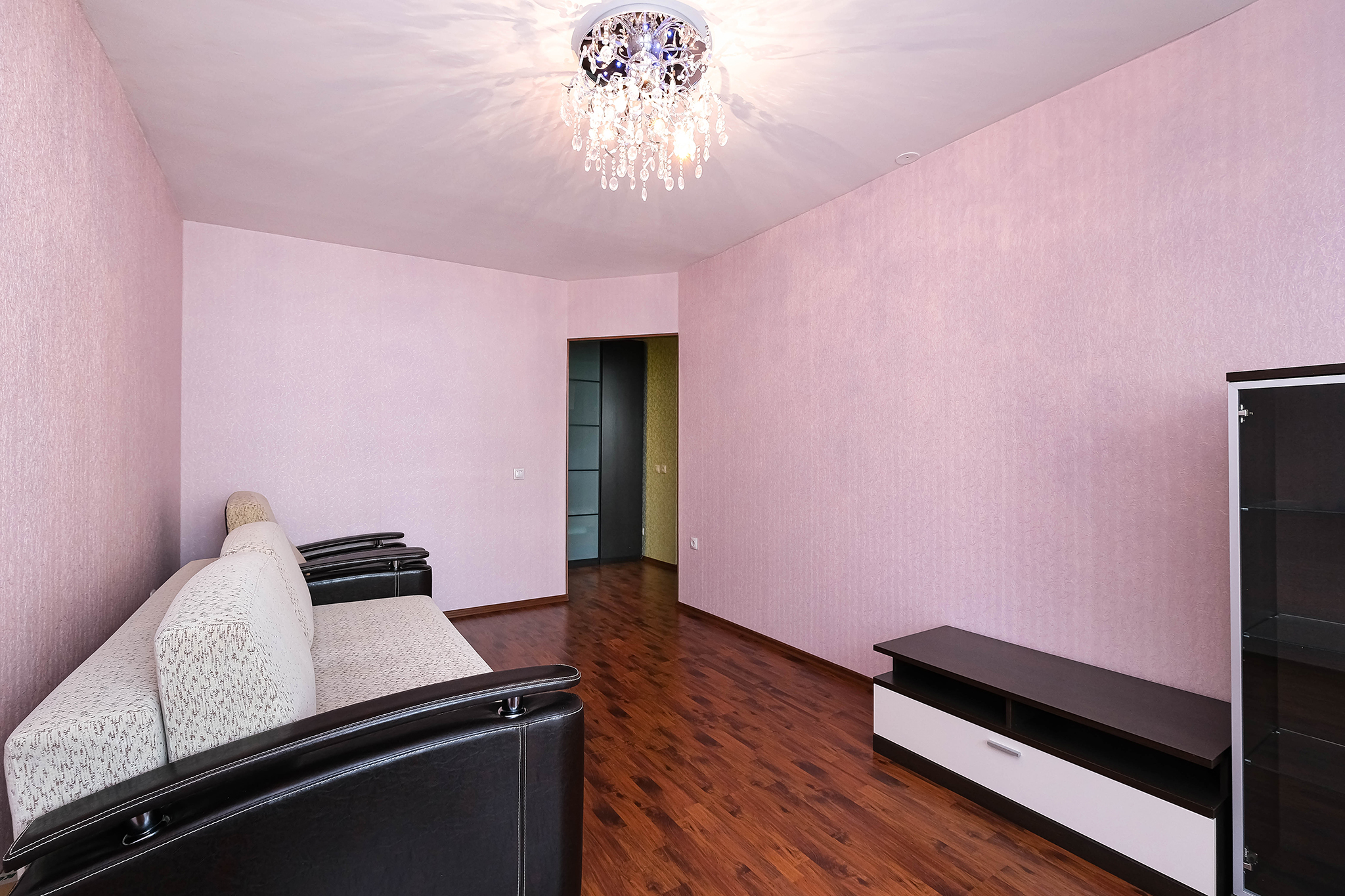 - в комнате кресло и диван, тумбочка под телевизор с местом для хранения, шкаф-витрина с подсветкой (корпусная мебель Дятьково).