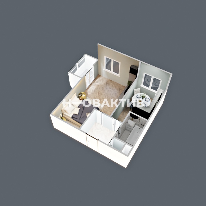 Удачная планировка: просторная комната 18 кв.м, кухня 7,3 кв.м, остекленный балкон с прекрасным видом.
