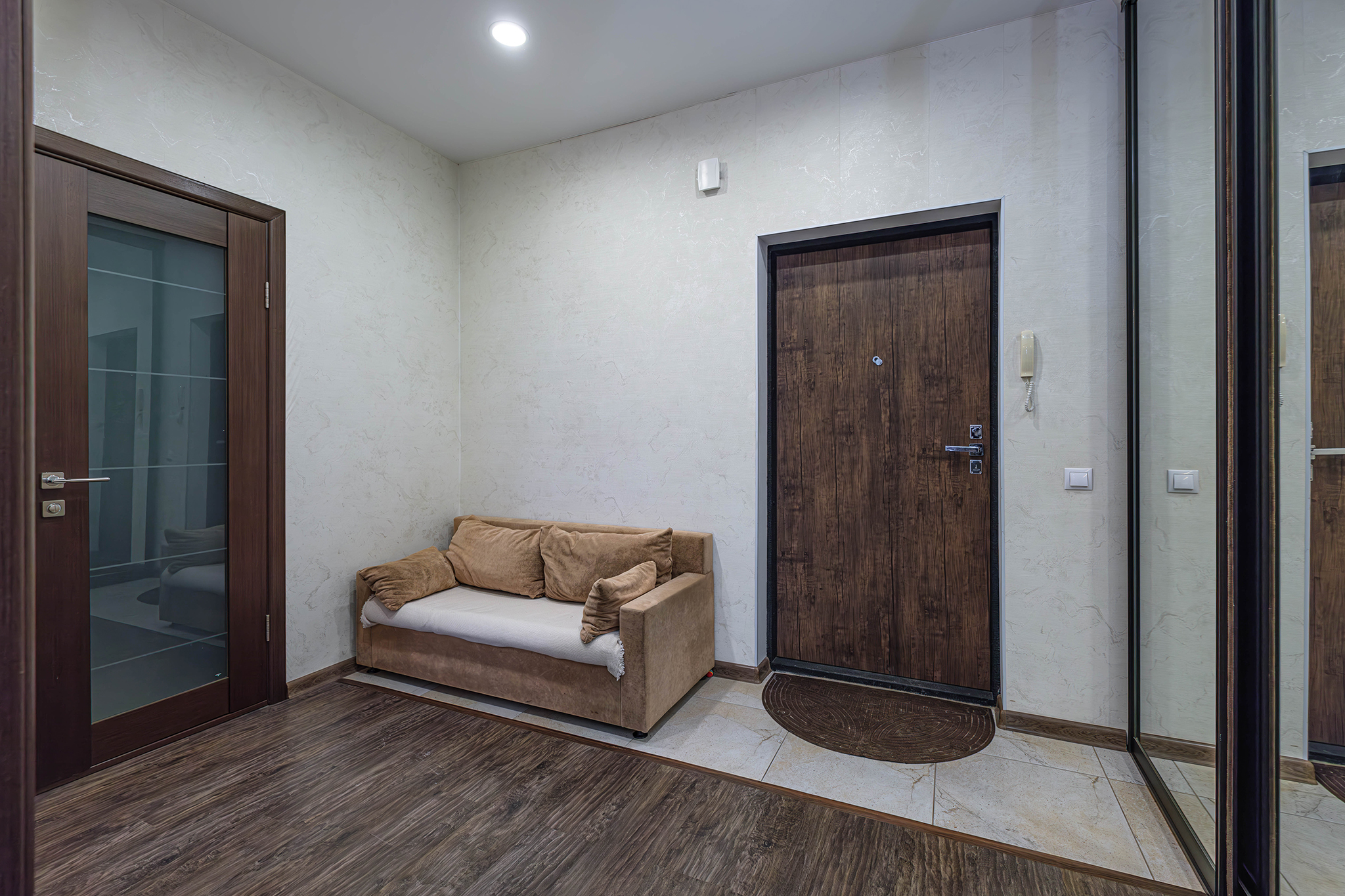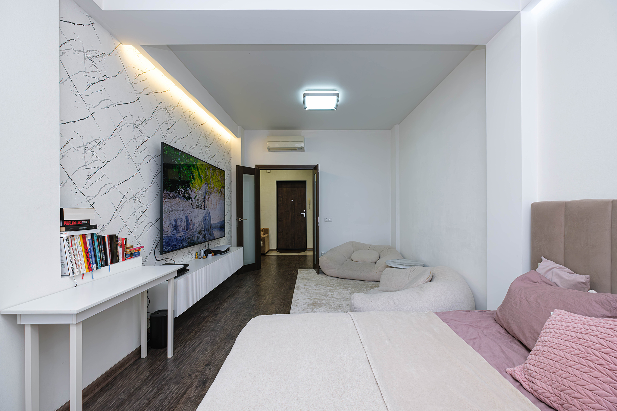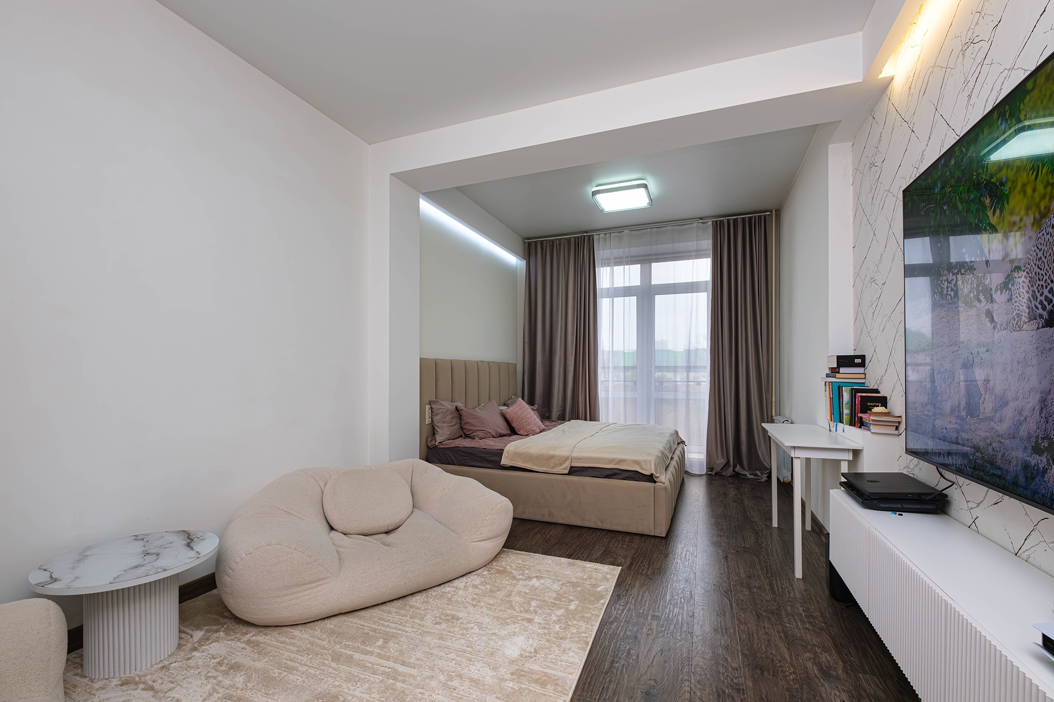 Планировка: просторная комната разделена на спальную и гостевую зоны с французским окном (в пол), оборудованная всем необходимым кухня с дорогой фурнитурой блюм (фасады мдф), в коридоре вместительная гардеробная, санузел совмещенный (просторный).