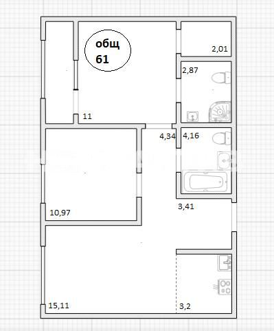 Общая площадь – 61 кв.м, жилая – 45 кв.м