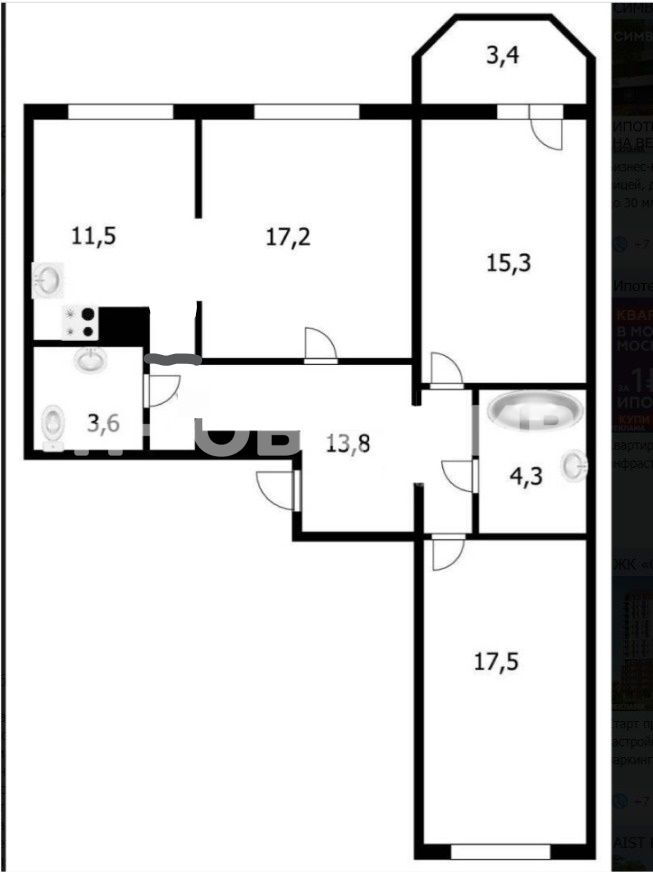 Квартира на две стороны в доме кирпич-монолит. Два санузла.