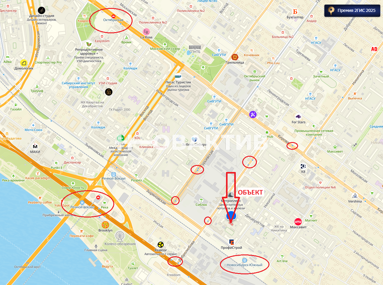 · В шаговой доступности: Остановки автобусов. ЖД Вокзал Новосибирск-Южный. до Метро «Речной Вокзал» – 1 км. до Метро «Октябрьская» – 1,9 км.