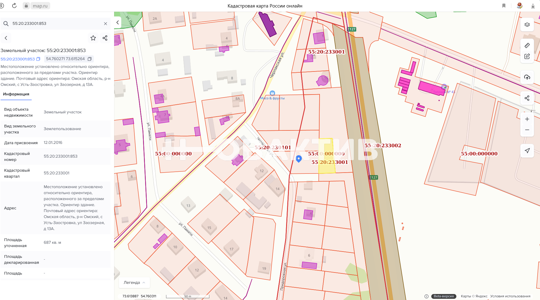 Кадастровый номер - 55:20:23001:853 - 687 м2 – участок расположен в территориальной зоне ОД-1 (Общественно деловая зона).