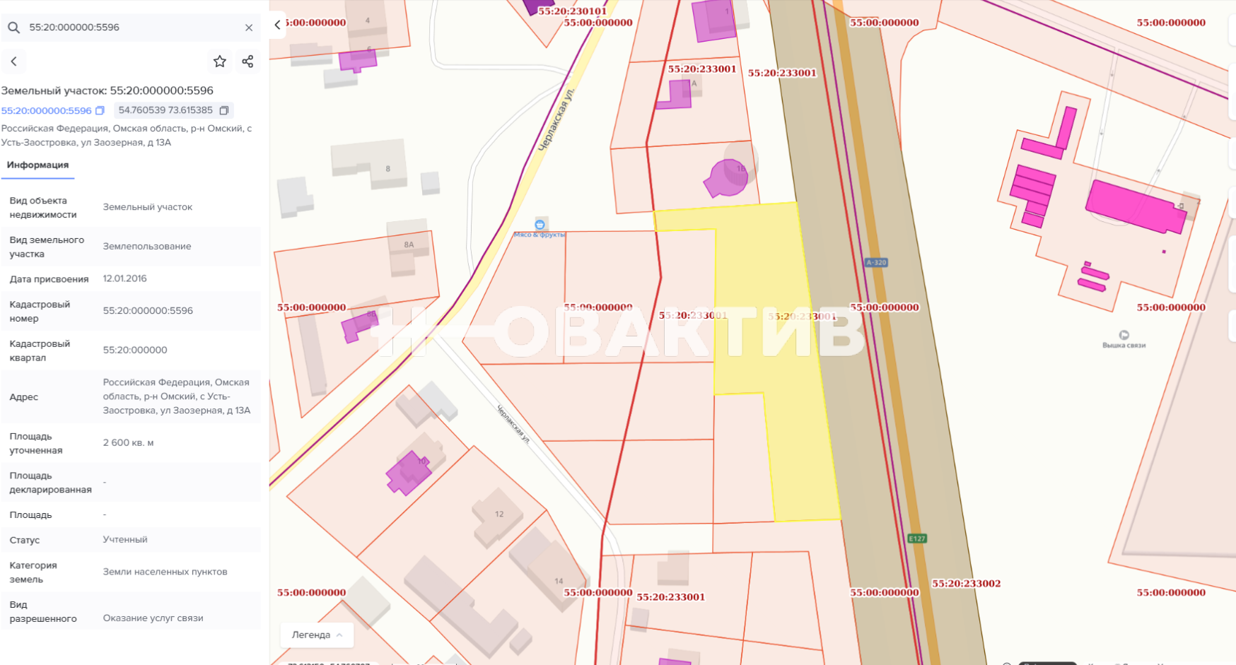 Кадастровый номер - 55:20:00000:5596 - 2600 м2 – основные виды использования – зона жилой застройки и ведения личного подсобного хозяйства – (Ж1)